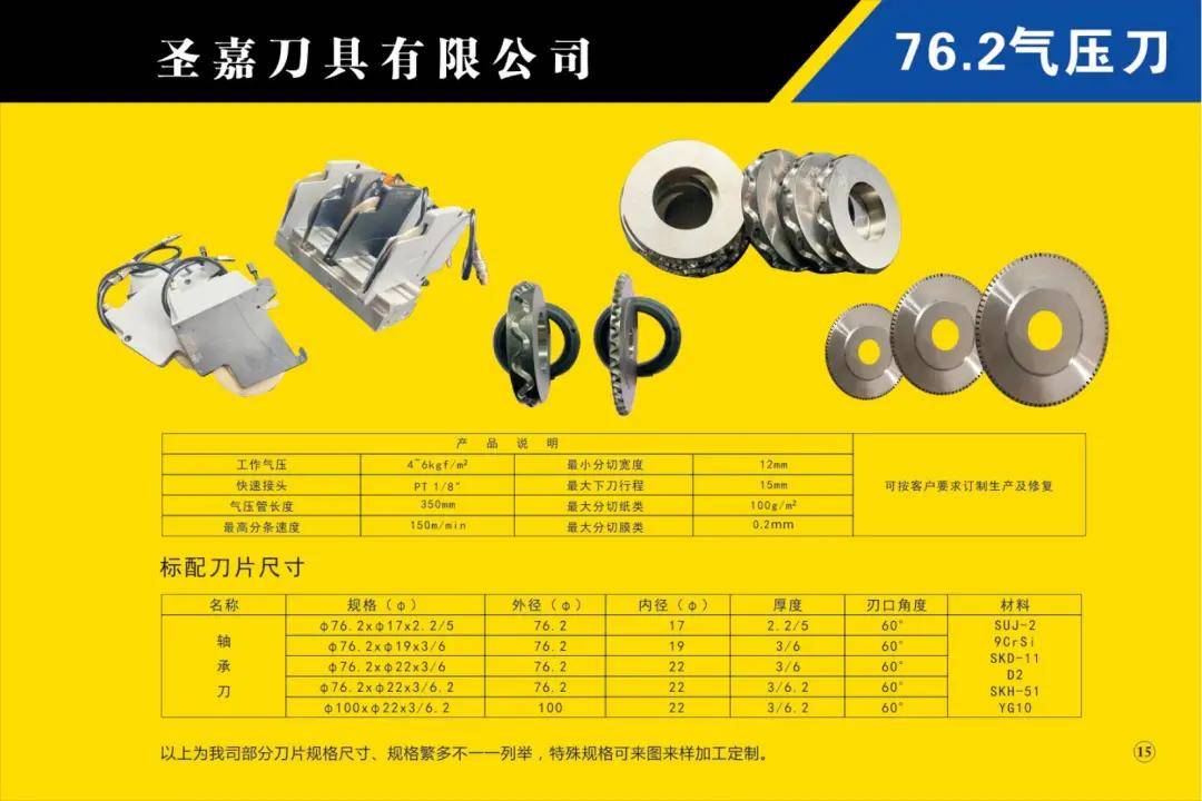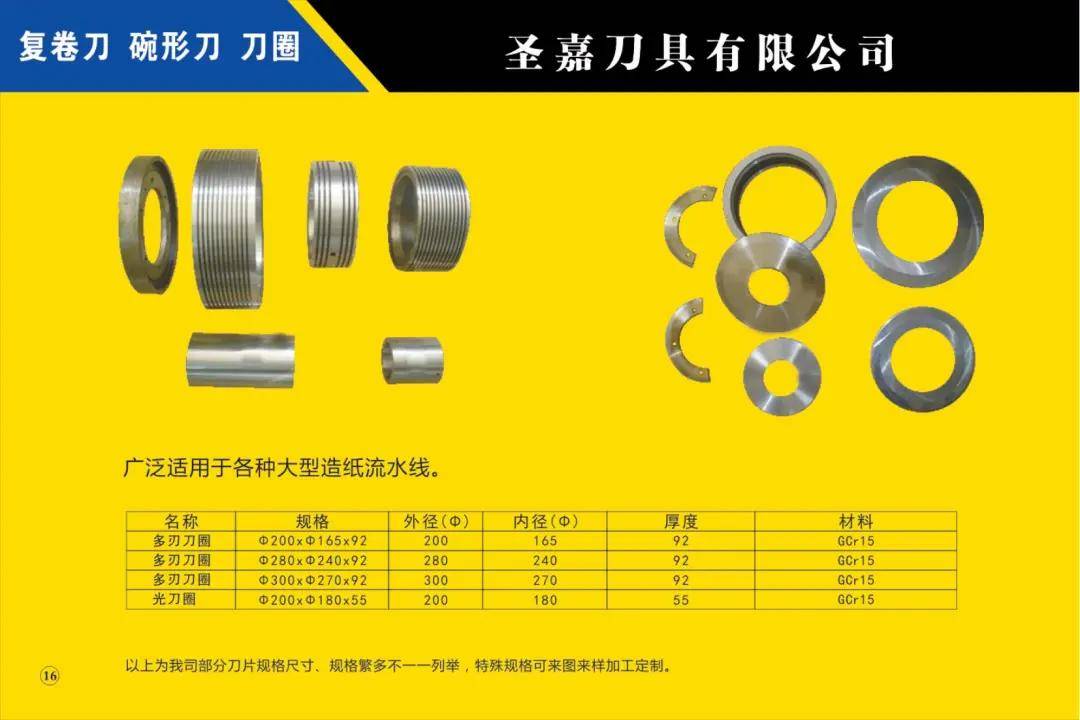 本公司所生產(chǎn)的各種型號規(guī)格分切、分條、分紙、復(fù)卷機圓刀片(蝶形上刀片、上刀架、下刀片、隔片、隔套、底棍、復(fù)卷刀、碗形刀、刀圈、大回旋圓切刀、砂輪、壓花輪、折疊刀、齒刀、異形刀)橫切刀、裁切刀、熱切刀、粉碎刀、切粒刀、撕碎刀、折頁刀、開槽刀、油墨刮刀、切臺圓刀、三孔刀、切管刀、氣壓刀組、剪切刀組、熱切刀組廣泛適用于造紙、紙制品加工、膠粘帶制品、薄膜、電線電纜、橡膠、輪胎、鋁箔、化纖、非織造布、復(fù)合包裝、卷煙、皮革、印刷、服飾輔料等行業(yè)。